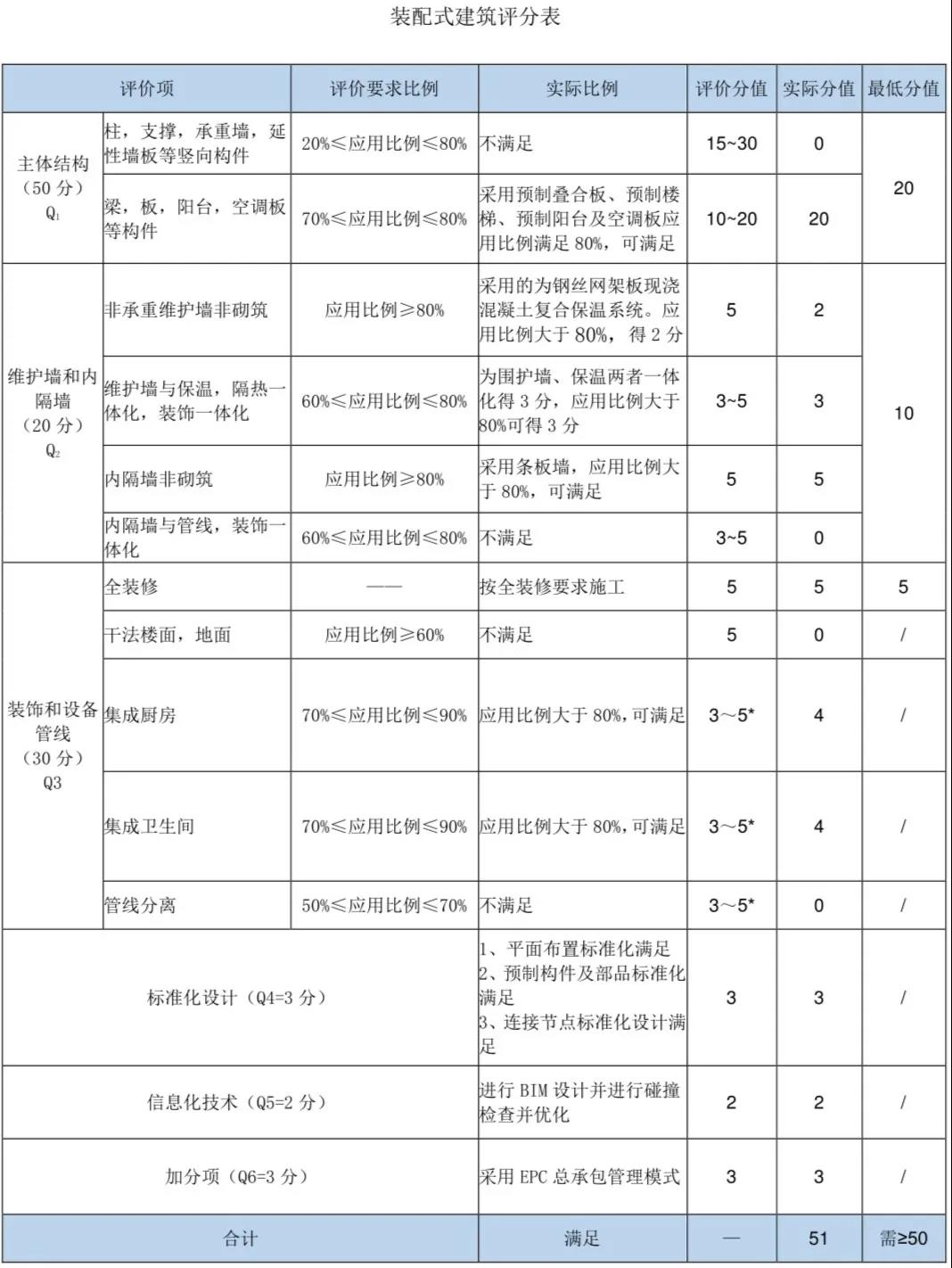注意 :實(shí)際做裝配式建筑的面積一般會(huì)超過政策要求的面積,在做目標(biāo)成本時(shí)需要注意留出余量。為了滿足整體項(xiàng)目產(chǎn)業(yè)化的要求,二期5棟高層(剪力墻結(jié)構(gòu))采用2-17層樓梯、1-18層樓板、1-18層外墻采用非承重墻非砌筑,建筑單體預(yù)制裝配率為51分。依據(jù)2018年11月下發(fā)的《山東省裝配式建筑評(píng)價(jià)標(biāo)準(zhǔn)》,計(jì)算明細(xì)詳見下表: